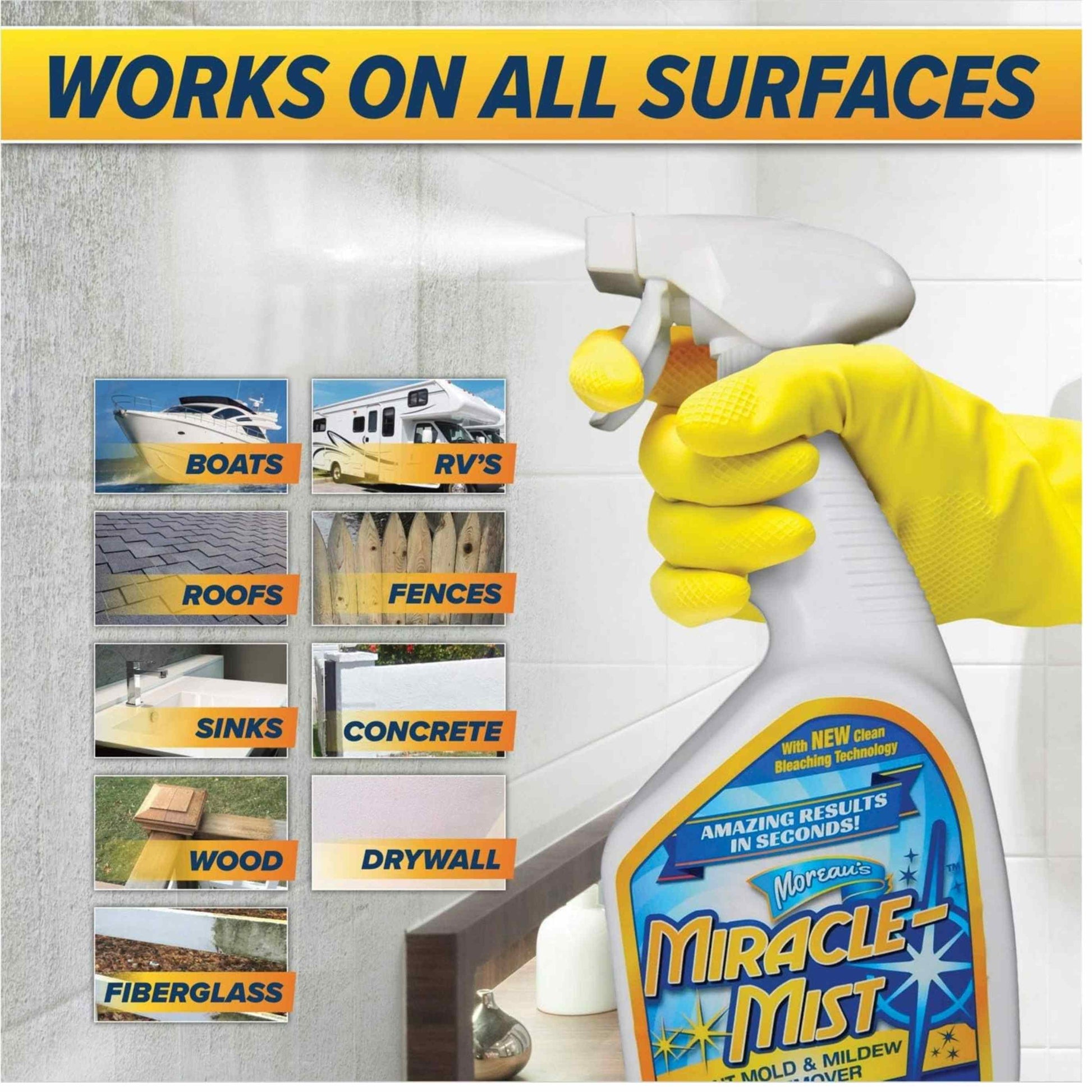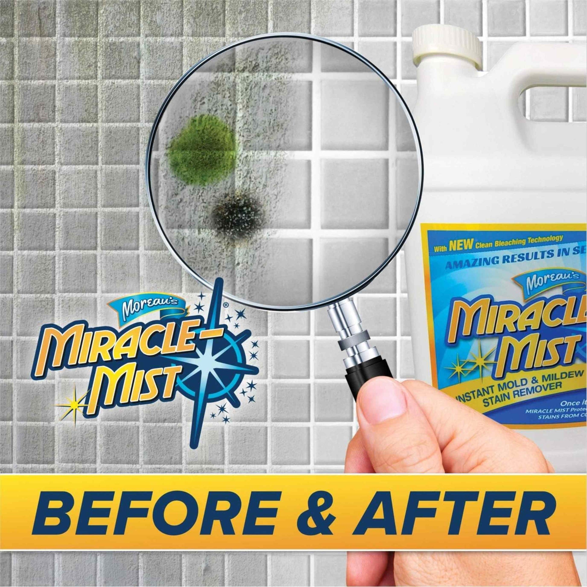 - LIFTS YEARS OF STAINS: MiracleMist Instant Mold & Mildew stain remover goes to work instantly, cleaning before your eyes! Its multi-functional chemistry allows wetting agents to penetrate deep into hard and soft surfaces, lifting years of dirt, grime, mold, mildew, and algae to the surface where a modest amount of bleach and detergents remove the stains permanently! Just rinse with light water and your job is done! Just look at everything MiracleMist can clean!